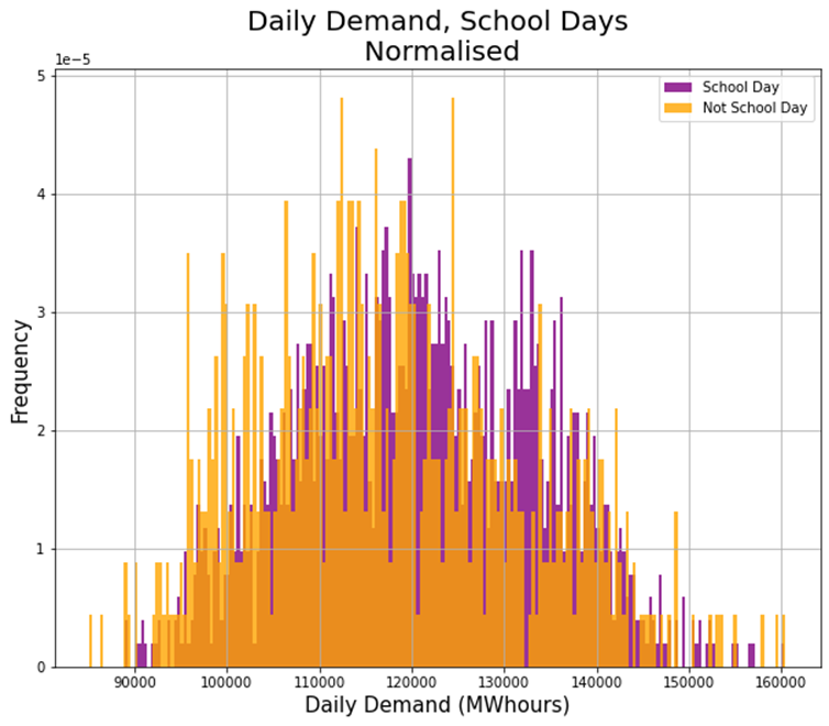 After normalizing the data to account for there being more school days in our sample. We plot a histogram of the typical daily demand on school days versus non school days. We can derive the following from the chart