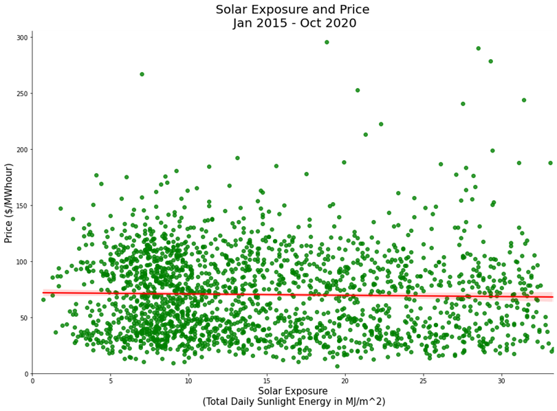 We speculated that a higher solar index would correlate with lower prices due to excessive solar supply. However there is no visible correlation between solar index and price