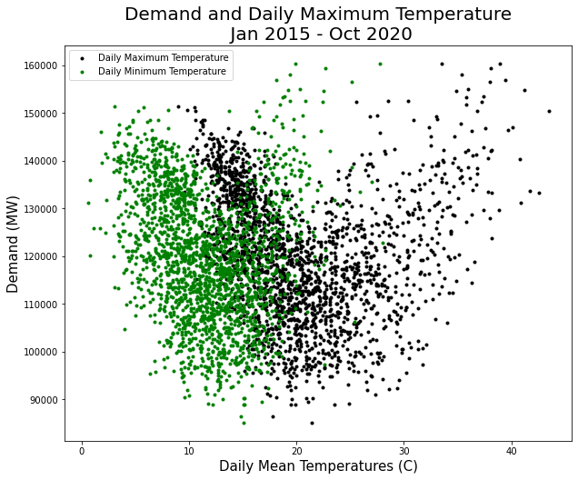 We can also create scatter plots that show how the electricity demand changes depending on the max/min daily temperatures. Interestingly we can see peaks at both high and low temperatures, and reduced demand at the milder temperatures at the center of the data charts.