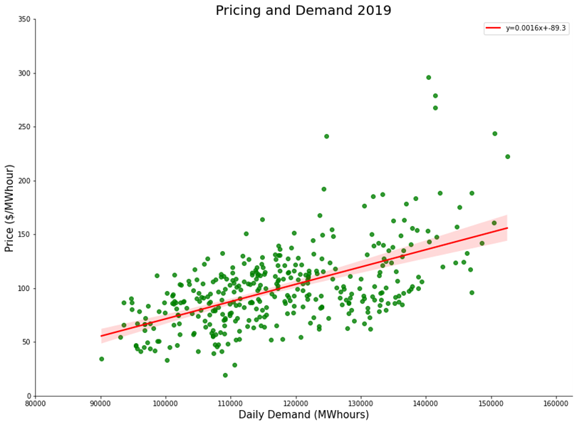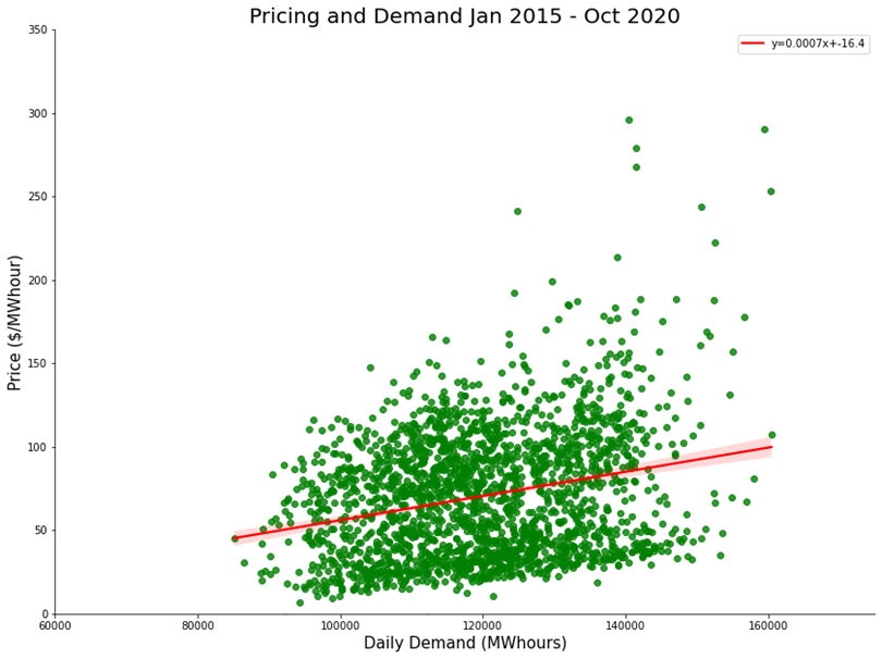 First up we create a scatter plot to see how the price of electricity prices change with demand. There is a strong positive correlation, which is to be expected.